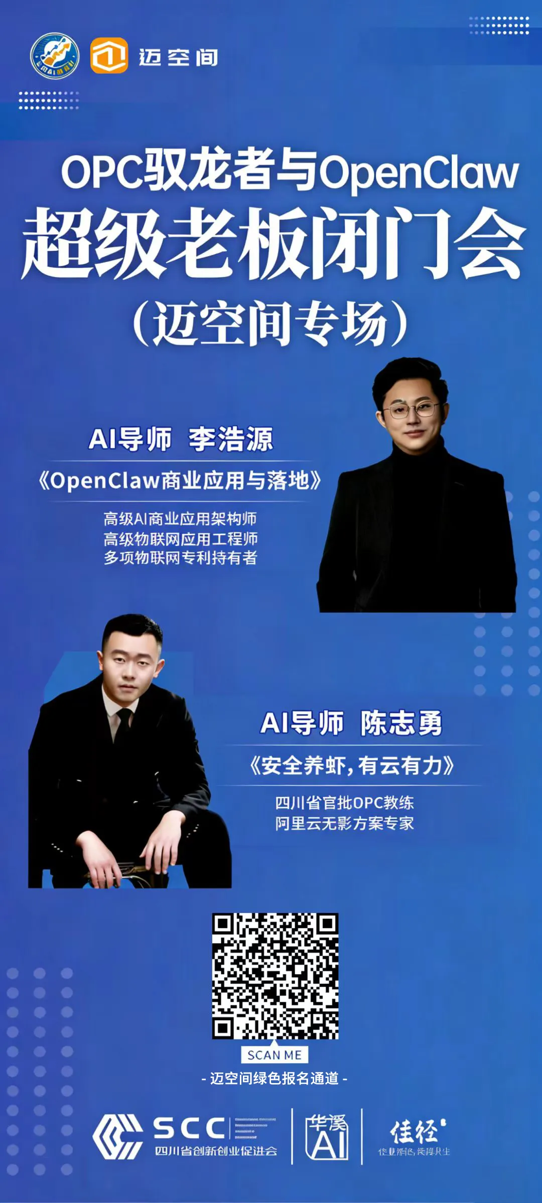 OPC(超级个体)时代,如何借AI实现“单人成军”?如何让技术转化为商业价值?本周四,咱们#天府AI掘金社 OPC城市巡讲首站落地成都,携手迈空间,带来“养虾”安全实操与商业应用闭门分享会,为四川创业者送上干货赋能课。