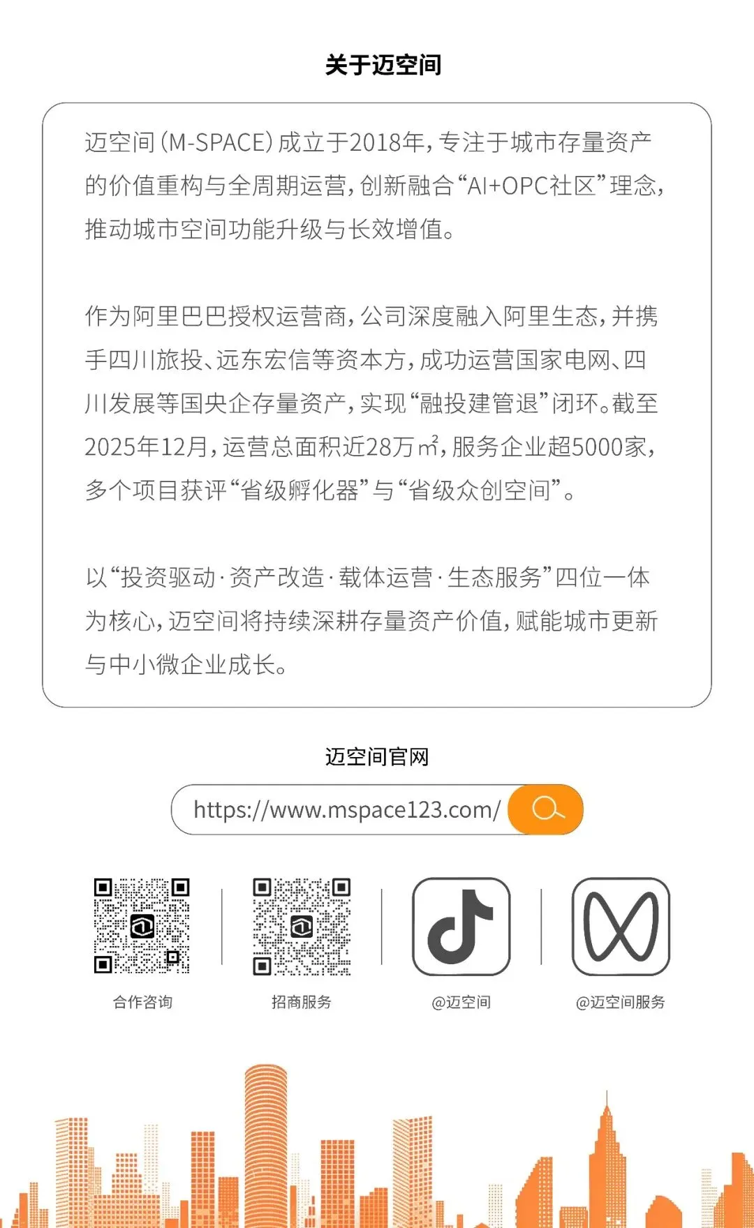 2025年,迈空间获阿里资产“城市运营商”授牌,成为成都首个认证伙伴。依托“AI+运营+OPC社区”赋能模型,迈空间已在多个标杆项目完成模式验证,2026年将全面推进OPC社区规模化落地,实现“一人成军、全行业链接”。