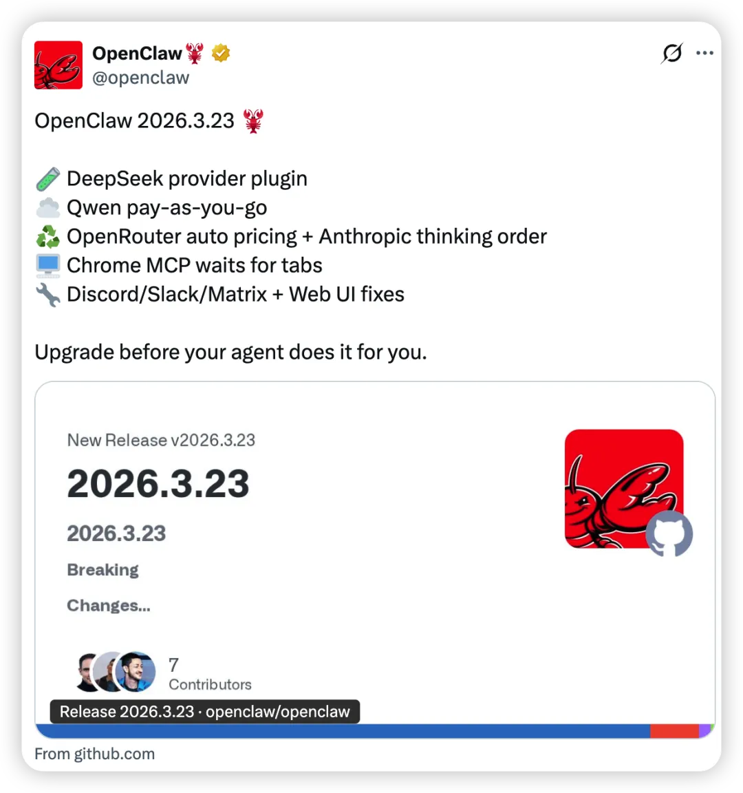 就在刚刚,OpenClaw 官方又发布了v2026.3.23版本!就在很多人还在为解决昨晚更新 v2026.3.23 版本之后发现微信、飞书等插件无法使用而反复折腾时,没想到 OpenClaw 效率惊人,不仅修复了bug还附带了很多扩展升级,有网友评价:"OpenClaw 10 天的更新比 Siri 10 年还多" 😂