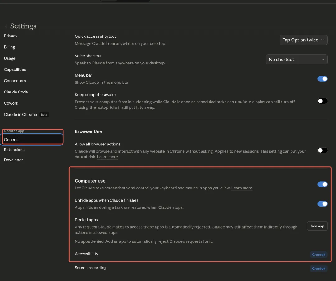 先把Claude Desktop更新到最新版,然后在设置里打开Computer Use开关,授权两个系统权限(辅助功能和屏幕录制),就可以了。三步,一分钟搞定。