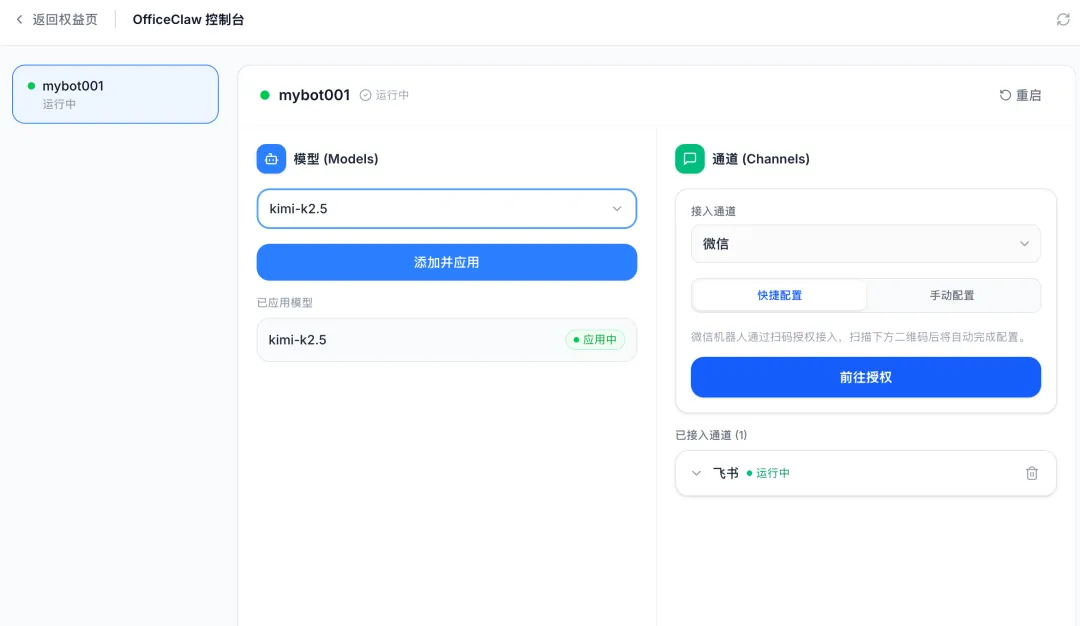 AISpeech OfficeClaw是首批接入微信的平台。在AISpeech OfficeClaw平台付费订阅后进入控制台,在控制台选择接入“微信”,点击前往授权获得二维码,用微信“扫一扫”直接扫描,授权配置成功后,便可进入“微信ClawBot”界面。