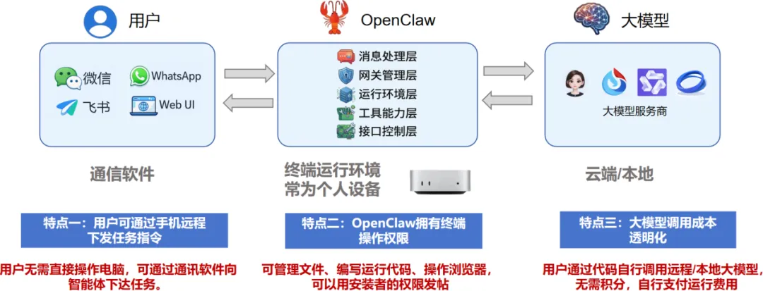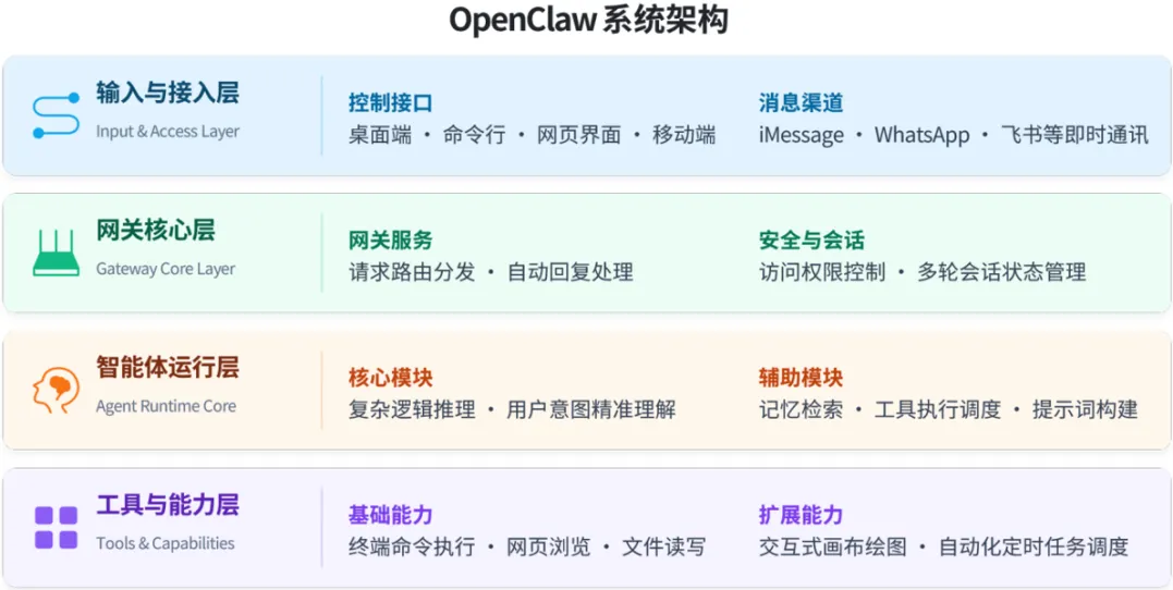 分析:OpenClaw在系统架构上将消息通信、接口接入与思考执行逻辑解耦,构建了统一的AI助手接口。无论用户通过飞书还是钉钉发送消息,均可接入同一套智能体系统。与此同时,所有会话状态、工具权限及运行上下文均由本地设备统一管理,从而提升了系统的一致性、安全性与可控性。