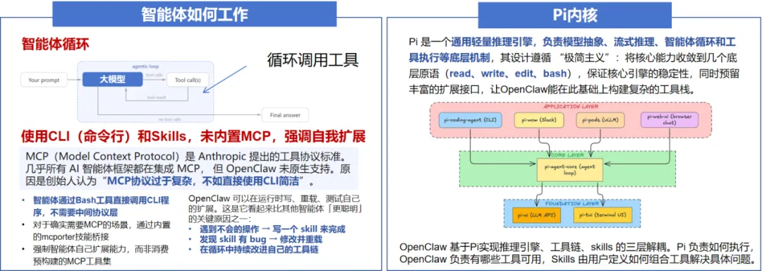分析:在智能体调用工具的过程中,OpenClaw更多使用命令行界面(CLI)。此外,在智能体内核选型上,OpenClaw采用简洁高效的Pi项目作为核心底座,实现稳定模型调度与任务运行支撑。