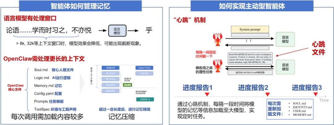 大模型通常受限于固定的上下文窗口,超出窗口长度的内容将无法被继续处理。OpenClaw在每次调用大模型时,需一并加载自我认知、配置参数、历史记录等大量上下文信息,需通过记忆模块对超出窗口长度的上下文内容进行有效管理和动态维护。