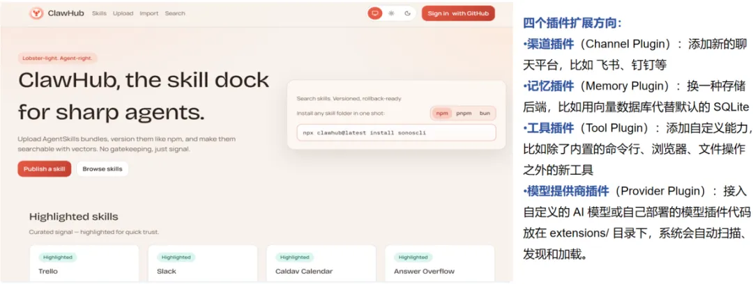 分析:OpenClaw通过安装插件实现能力的扩展。当前,用户可通过ClawHub等渠道便捷安装各类插件与技能模块,丰富其功能边界与应用能力。