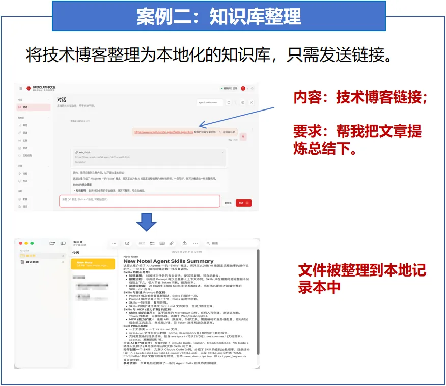 使用流程上,用户向OpenClaw提供技术博客链接,并发送“帮我把文章提炼总结下”的自然语言指令。OpenClaw接收到指令后,自动解析链接对应的技术博客内容,完成信息的抓取、读取与理解,随后对博客中的核心技术观点、知识逻辑进行提炼与总结,将整理后的结构化内容同步整合至本地记录本中,完成本地化知识库的搭建。