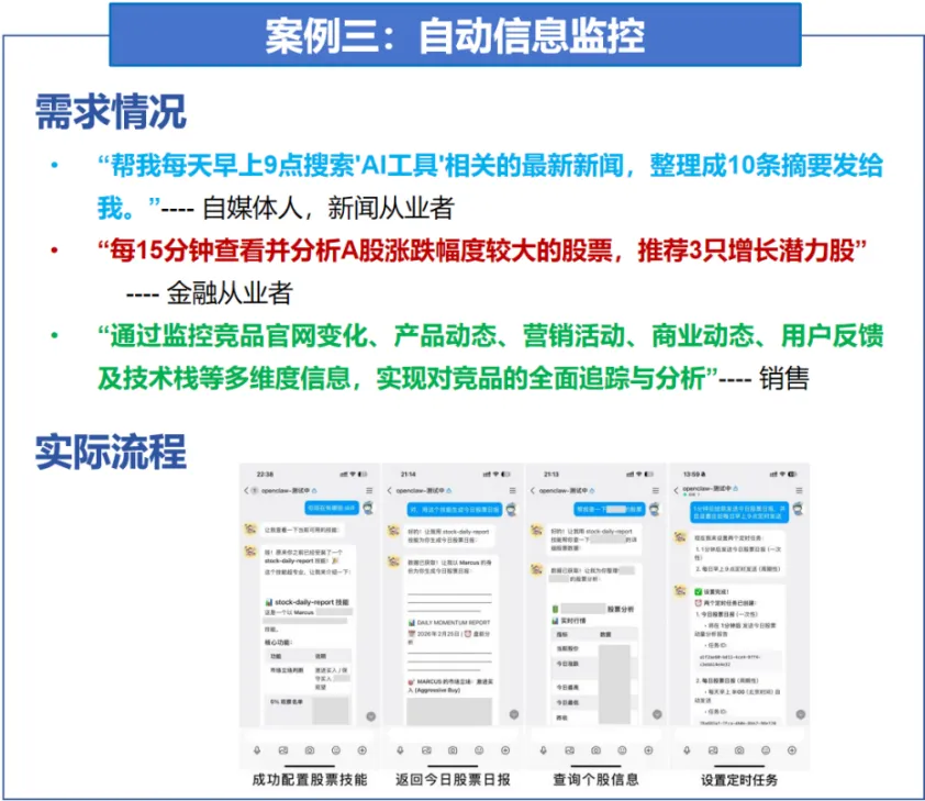 在OpenClaw的应用体系中,自动信息监控被视为开发者的“数字哨兵”,可在24小时无间断地在互联网、金融市场或特定官网上巡检。对于自媒体与新闻从业者,它可以作为“早报编辑”,定时搜索特定领域的最新资讯,并自动提炼摘要;对于金融从业者,它化身为“量化助理”,能以分钟级的频率监控股市波动;而对于销售与市场人员,它则是“竞品情报员”,能敏锐捕捉对手官网上的商品变动或营销活动更新,实现全方位的商业情报追踪。