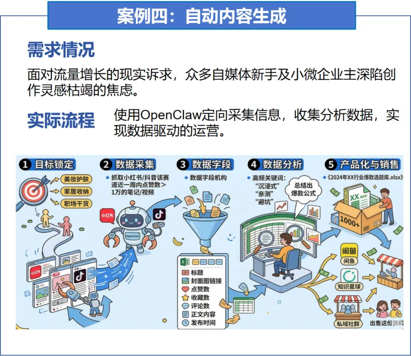 最终,OpenClaw将上述分析汇总成结构化的数据库,开发者利用这些结论指导AI批量生成高质量文案,也可以将整理好的数据包发布至闲鱼、知识星球等平台进行二次变现,实现内容生产到流量获利的自动化闭环。
