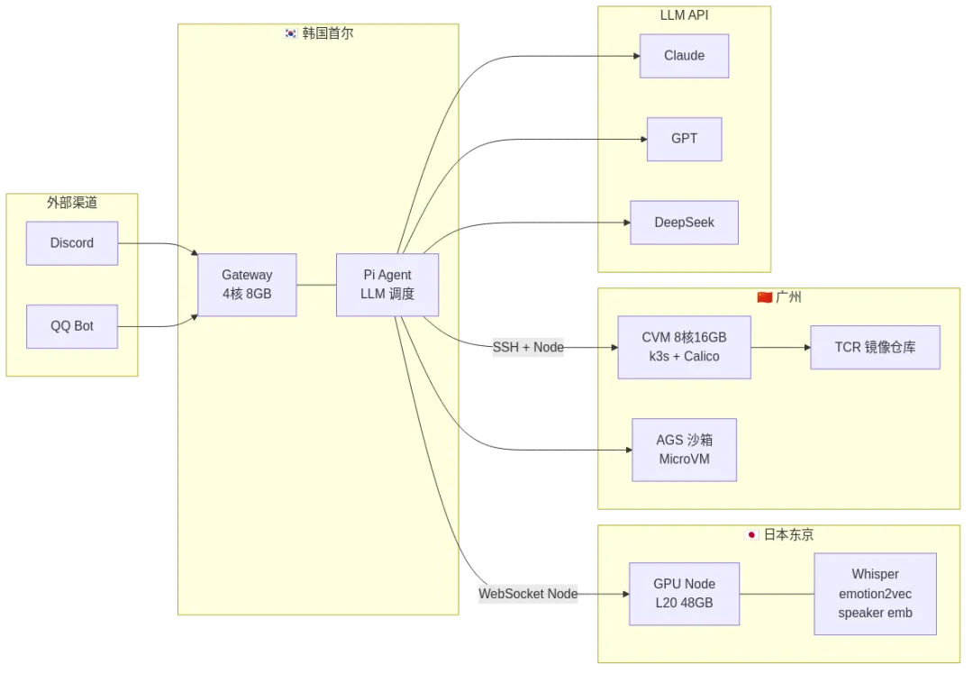 一句 Discord 消息的完整旅程:手机 → 韩国 Gateway → Claude API 推理 → 日本 GPU 语音分析或广州沙箱执行 → 结果原路返回。全程自动,用户只看到最终回复。