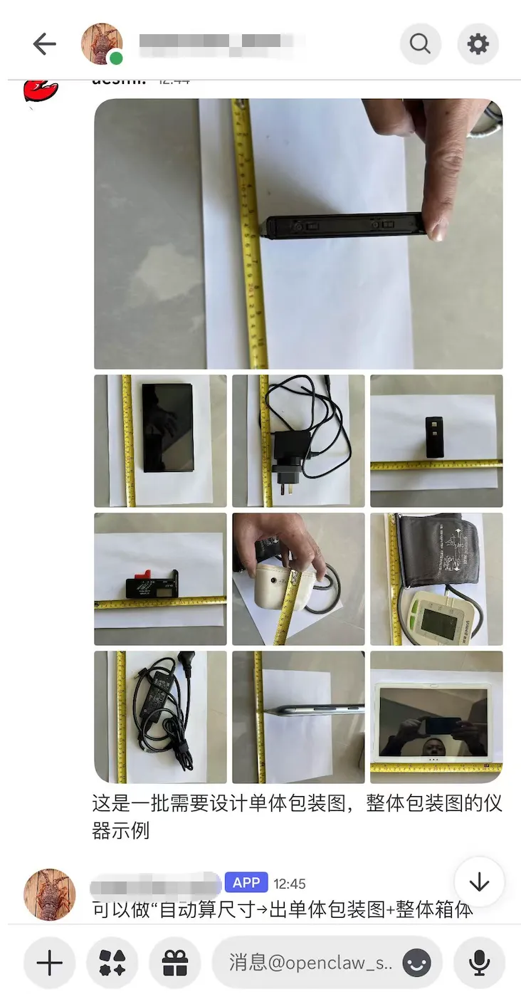 OpenClaw 怎么做的:沟通需求后,OpenClaw让我先用A4纸+尺给他拍照让他能够大概读取到尺寸比例,给出实物照片后,Agent并没有直接给方案,而是不断追问:
