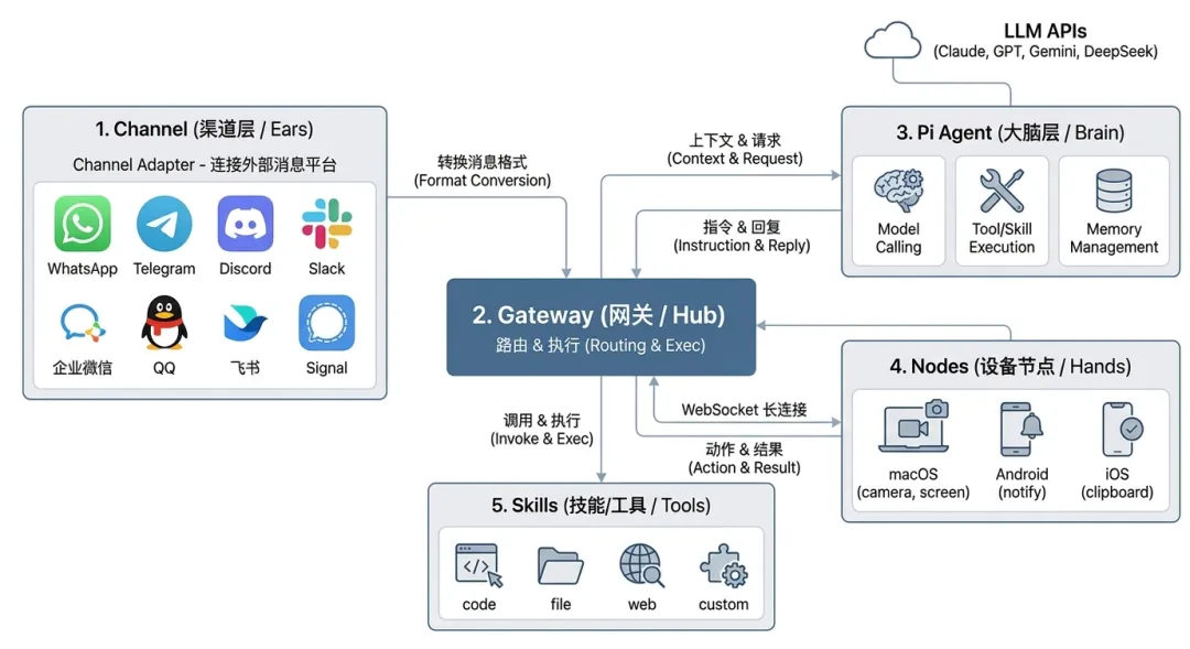 • Gateway(网关)——系统中枢。单进程守护服务,负责消息路由、会话管理、安全鉴权和任务调度