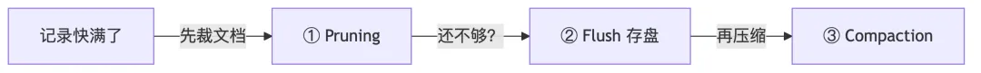 如果裁完文档空间还是紧张,说明你和助理确实聊了很久、积累了大量对话。这时系统悄悄触发一个隐藏回合:助理在这个回合里把重要决策、未完成的 TODO、关键约束写入一个日记文件(memory/YYYY-MM-DD.md,追加不覆盖),然后静默结束——你完全无感。先把要点记到本子上,再放心清理群记录。③ Compaction——旧对话变摘要