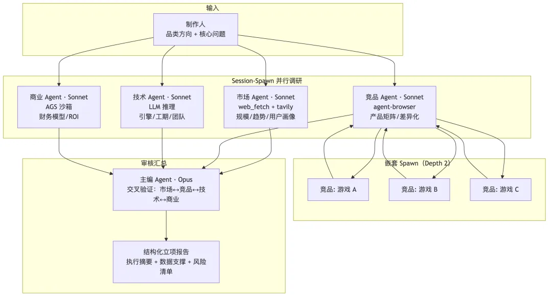 主编 Agent(Opus,强推理)同时 Spawn 4 个子代理(Sonnet,成本低),各负责一个调研维度。配置 maxSpawnDepth: 2 允许竞品 Agent 再为每款竞品 Spawn 分析子代理——从"一个人串行看 200 款游戏"变为"4 个专家同时分析 200 款游戏的不同维度"。工具按需组合:市场 Agent 用 web_fetch + tavily-search 搜索公开数据;竞品 Agent 用 agent-browser 爬取 App Store/TapTap 评分和下载量;商业 Agent 在 AGS 沙箱中用 numpy/matplotlib 建立财务模型。主编汇总 4 份子报告后做交叉验证——市场数据与竞品分析是否自洽、技术评估与工期预测是否合理、商业化模型与用户画像是否匹配。这是人工调研中最容易被跳过但最有价值的步骤。调研经验沉淀到记忆,后续复用框架只需更新品类数据。半年后积累 10+ 品类数据可做跨品类对比分析——这种知识积累在传统人工调研中几乎不可能实现。 同样的协作模式可以直接迁移到技术选型、合规审查、投资尽调等任何需要多维信息汇总的决策场景。