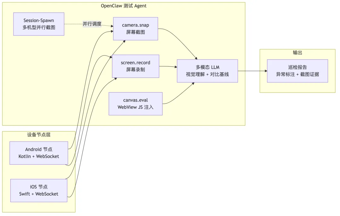 方案说明:OpenClaw 的 Android/iOS 原生节点应用通过 WebSocket 连接 Gateway,camera.snap 截图传给多模态 LLM(Claude Vision / Gemini),LLM 直接理解画面内容——"这是登录页""背包里有 3 个红点""战斗结算显示胜利"。不依赖控件树,截图就是一切。 游戏内活动页(充值、限时商城、公告)通常是 H5 WebView,canvas.eval 可在 WebView 中注入 JavaScript 执行 DOM 操作和断言——这是游戏测试中最接近传统自动化的能力。利用 Session-Spawn 并行机制同时对 5-10 台不同机型执行截图,AI 对比同一页面在不同分辨率/刘海/挖孔屏上的显示效果,自动标注 UI 遮挡、文字溢出、按钮变形。能力边界需诚实标注:Agent 可以"看"(截图 + 理解),但目前不能"操作"(无 touch 事件注入)。适合视觉回归审查和多机型适配检查,交互式自动化测试仍需 Appium/ADB 配合。建议混合方案——OpenClaw 做"AI 大脑"(理解、分析、报告),传统工具做"机械手脚"(精确操作、数据采集)。关键优势:Agent 可 7×24 不间断运行(前提是基础设施高可用),覆盖率远超人工轮班。随着截图断言标准化、操作指令协议打通、用例库持续积累——最终可以从"抽检"走向"全检"。