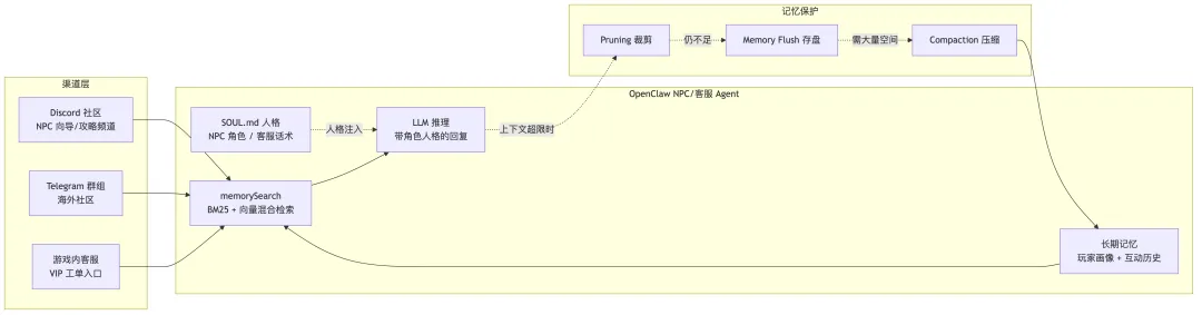 SOUL.md 人格定义——通过工作区 Markdown 文件定义 Agent 的人格:语气、世界观、行为边界。NPC 可以是游戏中的角色——酒馆老板、军师、向导——用角色口吻回答玩家问题;客服场景下定义专业话术、VIP 服务标准和问题升级规则。IDENTITY.md 控制 Discord 显示的头像和名字(映射为 webhook 身份),让 NPC 在社区中有真实的"角色形象"。 长期记忆 + 玩家画像——这是 NPC 和客服场景最核心的能力。Agent 记住每个玩家的互动历史——"张三是 58 级法师,上周推荐过冰法+奶妈组合""李四是 VIP8 大R,上次充值异常已补偿 500 钻,本月累充 2 万"。同一个问题,Agent 给不同身份玩家完全不同的回答——新手得到引导,老玩家得到进阶建议,VIP 得到优先处理和专属方案。memorySearch 支持 BM25 + 向量混合检索,能精确定位关键词也能找到"意思相近"的历史工单。三层记忆保护——NPC 和客服 7×24 在线,对话量远超普通场景。三层保护确保 Agent "永远不会忘记重要的事":Pruning 自动清理旧工具结果、Memory Flush 在压缩前静默写回关键信息、Compaction 将早期对话压缩为摘要。Agent 运行半年后,记忆中积累了完整的社区知识图谱和玩家服务档案。