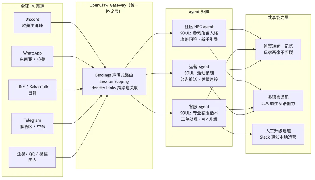 Bindings 多渠道路由——通过声明式路由同时服务多个渠道。Discord 攻略频道绑军师 NPC,闲聊频道绑酒馆 NPC,游戏内 VIP 入口绑专属客服。Identity Links 实现跨渠道记忆不断裂——玩家在 Discord 问过的问题,转到游戏内客服时 Agent 依然记得。