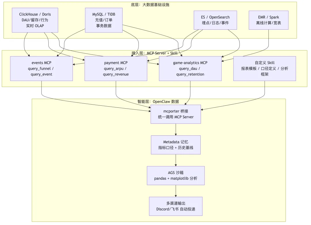 接入层——MCP Server + Skill 无缝对接。每个数据源包装为标准 MCP Server,暴露语义化接口(query_dau、query_retention、query_funnel)。数据团队的工作从"每天写 SQL"变为"维护 MCP Server 接口"——Agent 不需要知道数据在哪、用什么协议,只需通过 mcporter 统一调用。自定义 Skill 承载分析框架和报表模板:把常用的分析维度(区服/渠道/等级段)、指标口径(DAU = 当日在线 ≥ 5 分钟的独立用户)、报表格式封装为 Skill,Agent 在 bootstrap 时自动加载。新增一个分析维度 = 写一个 Skill 声明文件,不用改 Agent 代码。智能层——Agent 理解意图 + 沙箱执行 + 多渠道投递。运营在 Discord/飞书群里自然语言提问,Agent 解析意图后调用 MCP 查询数据,在 AGS 沙箱中用 pandas + matplotlib 做分析和可视化(参考数据:§一案例三 Steam 分析 Pipeline 实测 3 个沙箱处理 18,000 条记录需 86.9 秒,运营场景数据量和查询复杂度不同,性能需实际测试),结果自动投递回提问渠道。指标口径通过 Metadata 记忆注入,所有查询遵循统一口径——不会出现"两个分析师算出不同 DAU"的问题。