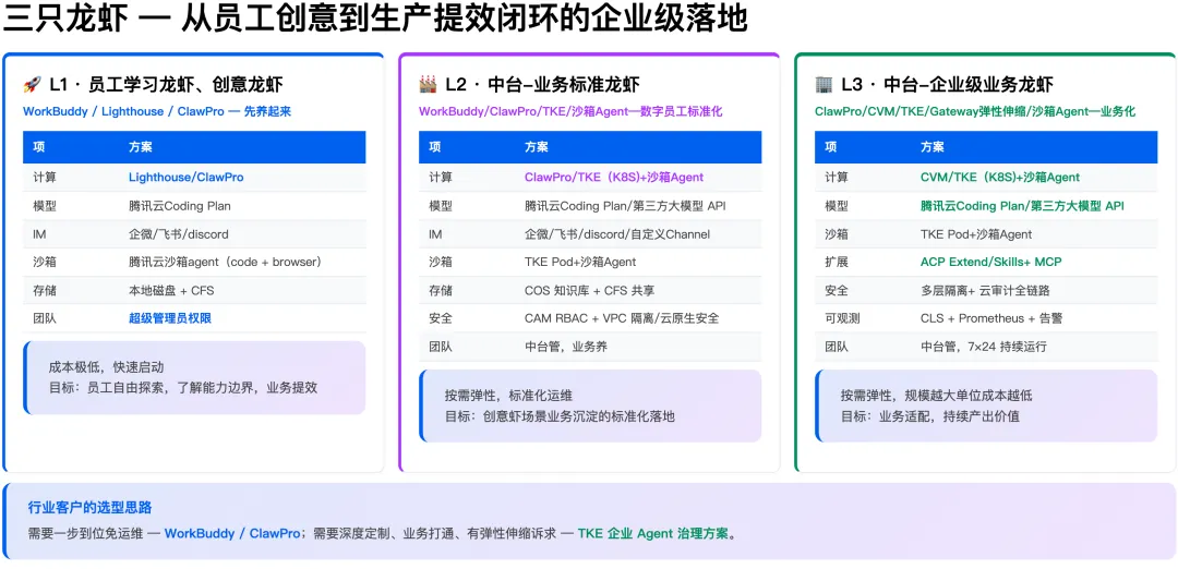 🚀 L1 · 员工学习龙虾、创意龙虾——Lighthouse 企业版 / CVM 单机,先养起来。成本极低、快速启动,目标是让员工自由探索、了解能力边界。模型接腾讯云 Coding Plan,IM 走企微/飞书/Discord,沙箱用腾讯云沙箱 Agent(code + browser),存储用本地磁盘 + CFS。个人就是一个超级管理员,隔离好身份权限,控制好爆炸半径。
