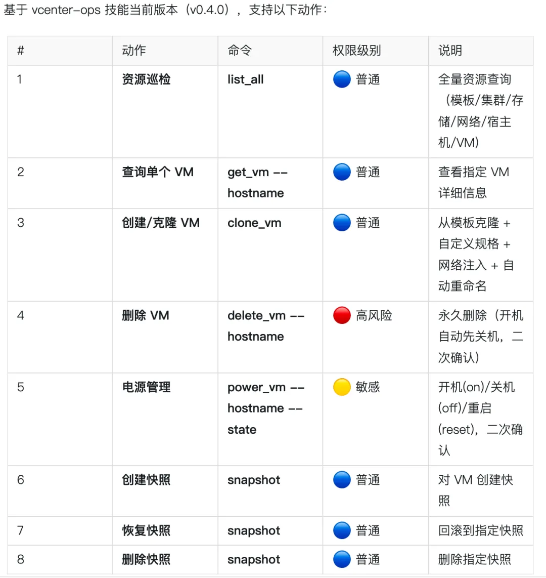 我这里自己先手写了个 vcenter-ops 的 Skill 目前主要功能如下: