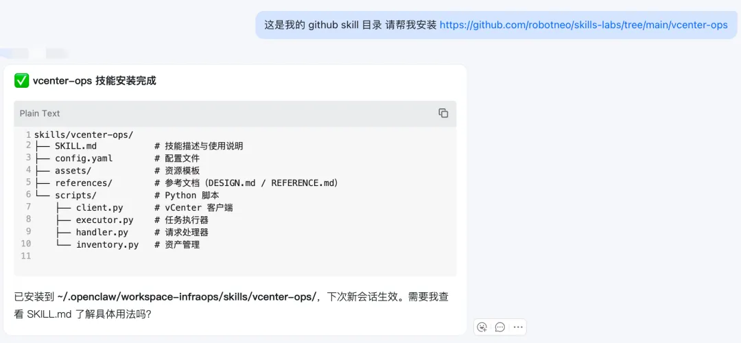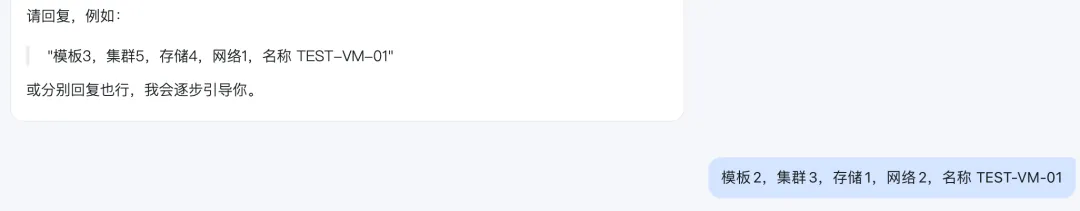 我们可以这么和它对话,只要触发虚拟机、VMWare、vCenter那么就可以进入这个 SKILL 的流程。