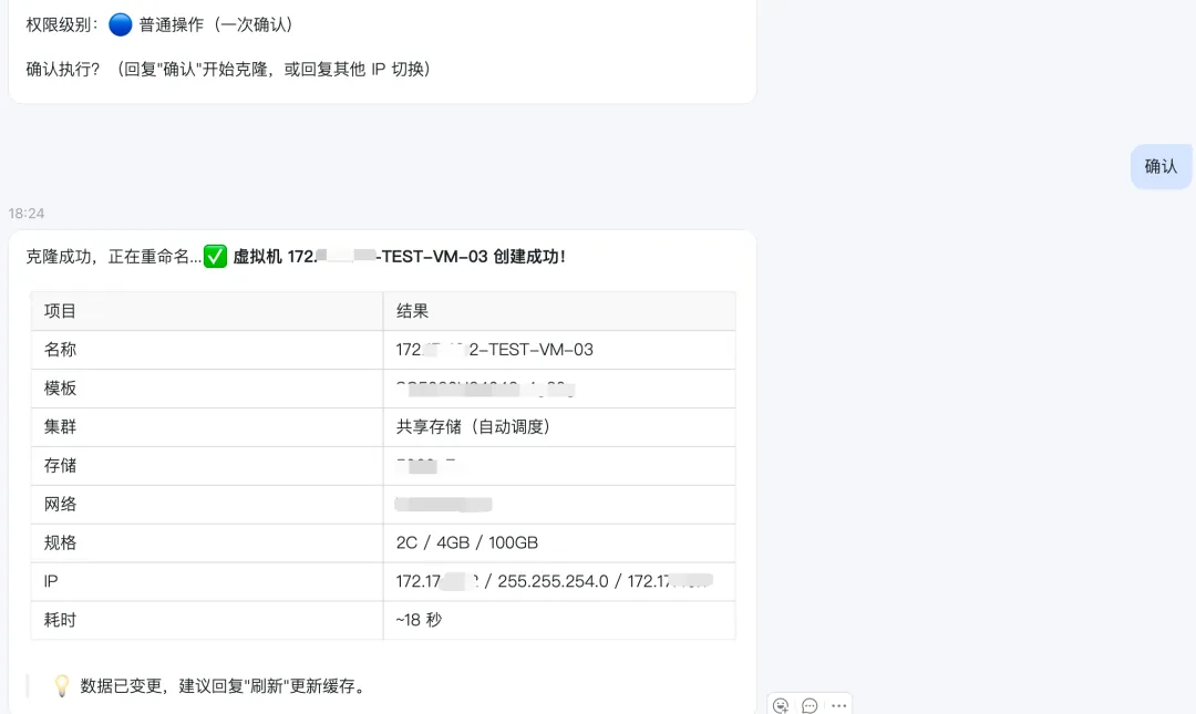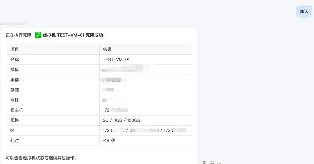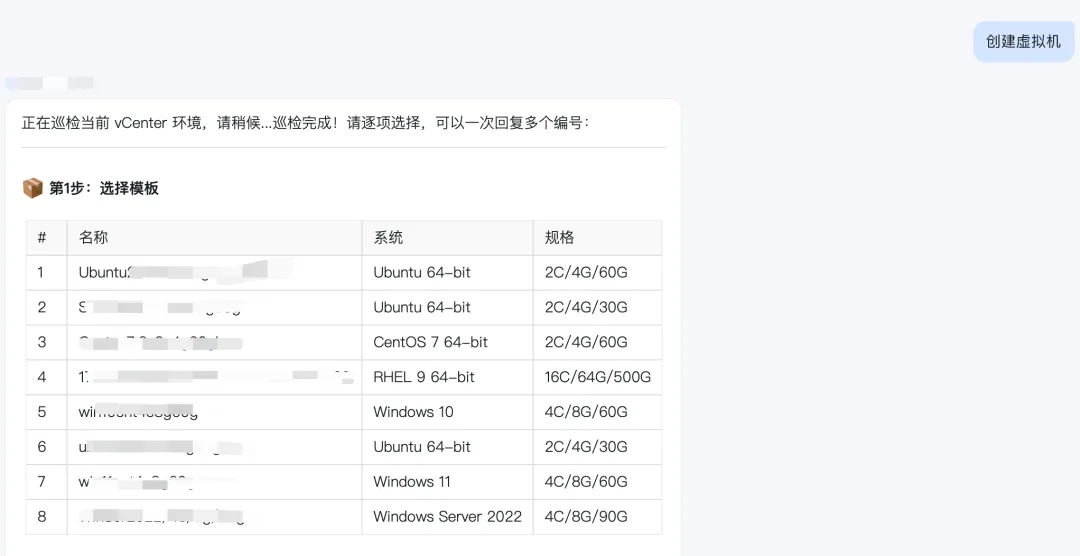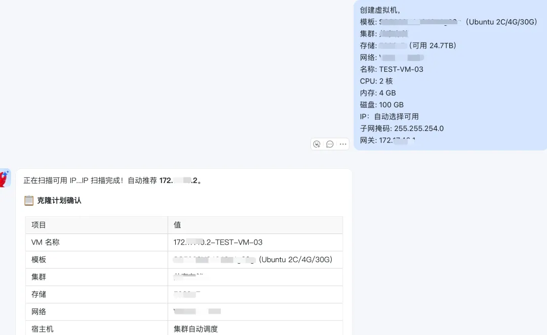 日常实际只需要 AI 提供一些常用创建模版,基本上就可以马上新建,如果对资源不确定,就叫 OpenClaw 推荐这个虚拟机落在那个集群,那个存储最优即可。