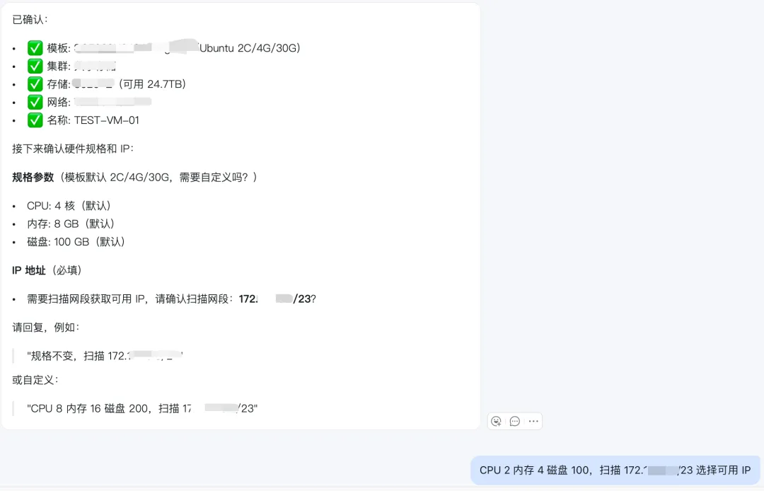 还有就是 IP 的管理,目前是通过扫描集群用到的 IP 和 ping 测试进行判断可用 IP 如果需要更加严谨可以接入内部维护的文档,比如飞书或者钉钉文档,然后对文档内的 IP 做检查(这个就是单独的 Skills ),其实像钉钉和飞书都已经有了,或者有 IPAM 也可以对接写个 Skills 加入这个工作流即可。