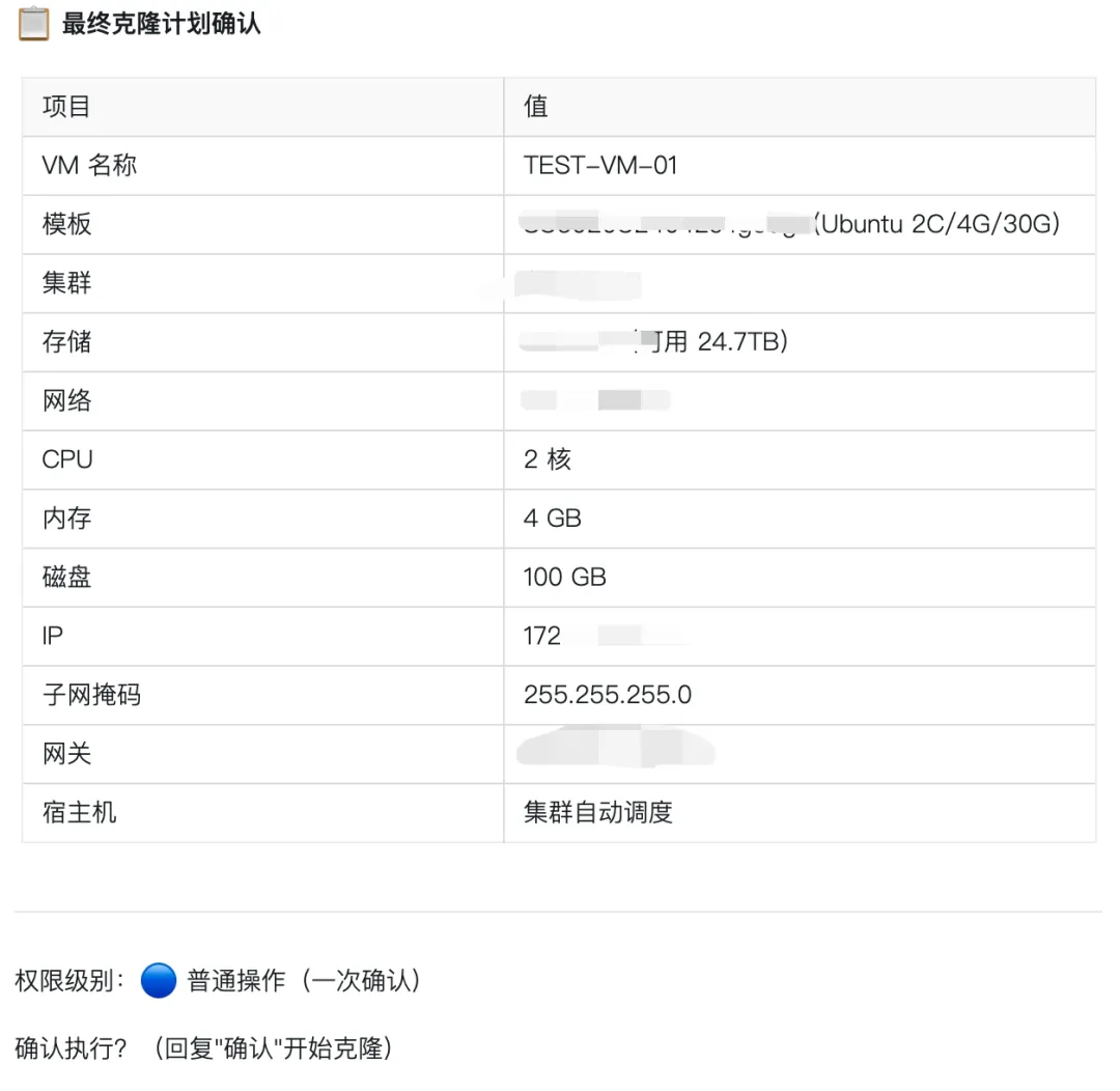 由于克隆是普通权限,只需要一次确认即可,如果是删除的动作是需要二次确认(防止手贱),如果为了安全可以对接审批流,这个就是后话了。