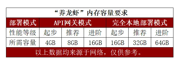 通过上面的表格我们可以了解到,在不同性能等级下完全本地“养龙虾”的内存容量需求: