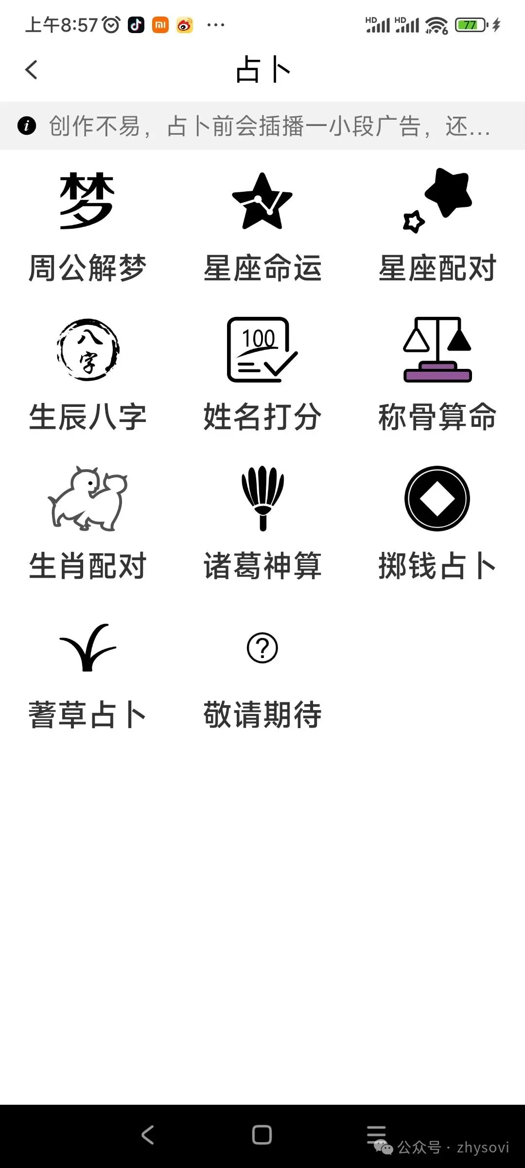 周公解梦,星座命运,星座配对,生辰八字,姓名打分,称骨算命,生肖配对,诸葛神算,掷钱占卜,著草占卜等内容。
