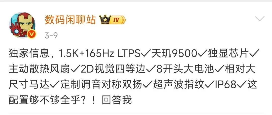 从曝光配置来看,升级确实够实在:天玑9500旗舰芯拉满性能,音质也采用了和K90 Pro Max同款的对称式双扬声器,由BOSE联合进行调音,外放效果特别的震撼。它还支持100W有线快充、50W无线充电。并且它具有IP68、IP69、IP69K全等级的防尘防水功能,再加上8500mAh大电池续航拉满,1.5K 165Hz高刷屏玩游戏丝滑,这次还加了主动散热风扇,散热能力直接上一个台阶。给了游戏党玩家一个很好的选择。