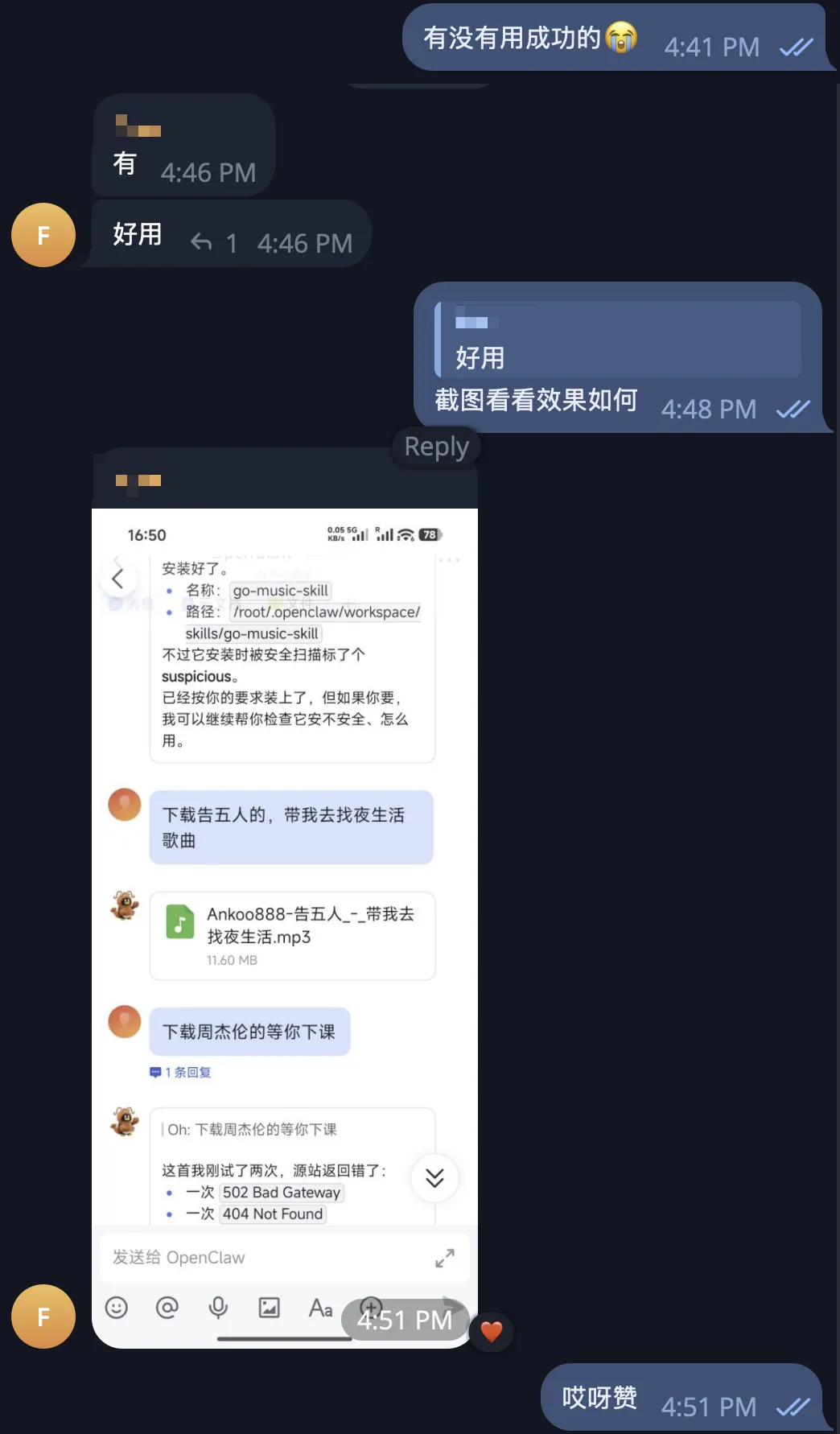 也有其他同学,成功了一半(飞书渠道):