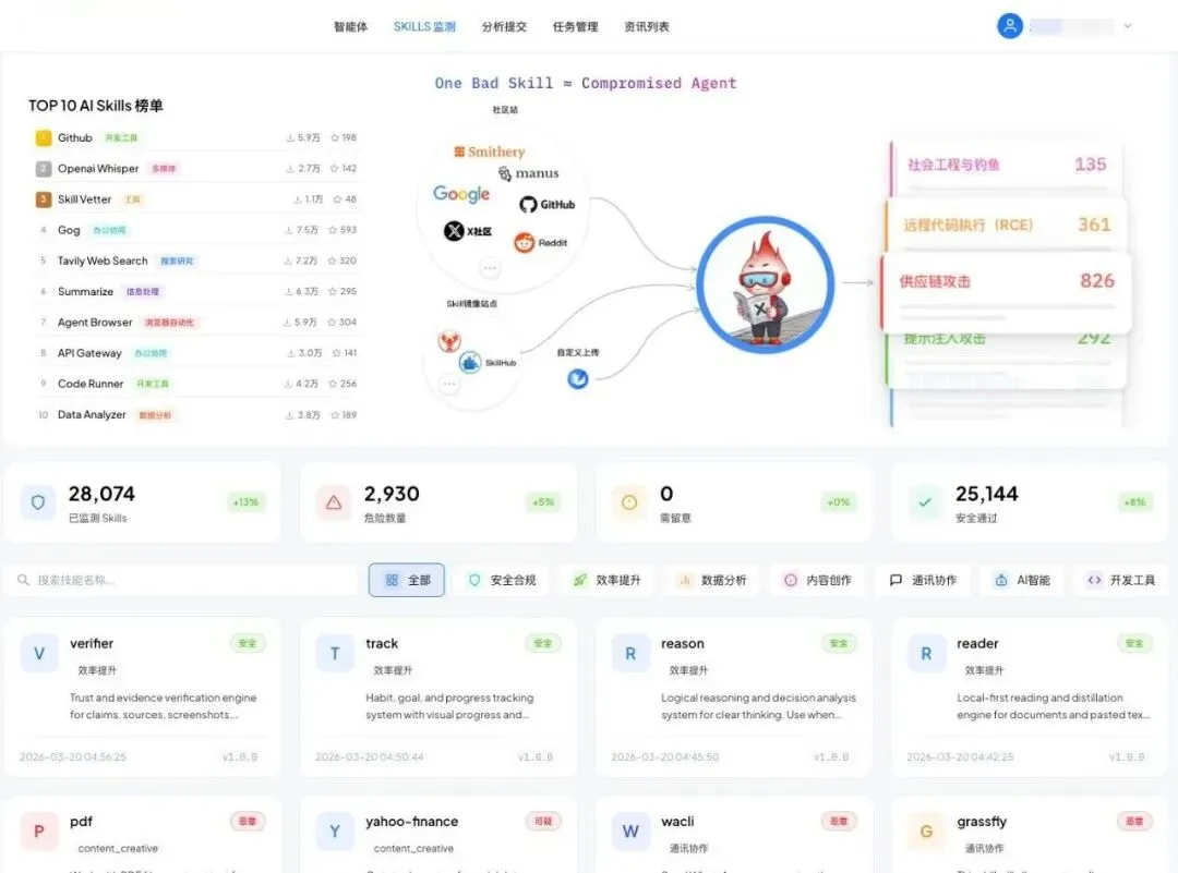 对所有新上架Skills进行全方位安全检测,包括行为分析、依赖检查、漏洞发现及恶意行为识别。