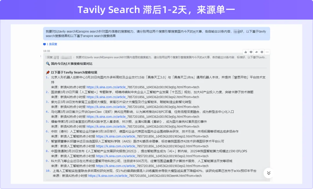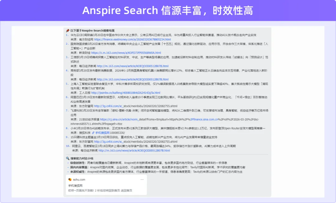 我们将OpenClaw分别接入不同的Search Skill进行对比测试:围绕国内的信息搜索,Anspire Search 信源丰富、时效性高;而 Tavily Search 滞后1-2天,且信息来源单一(左右滑动查看对比)