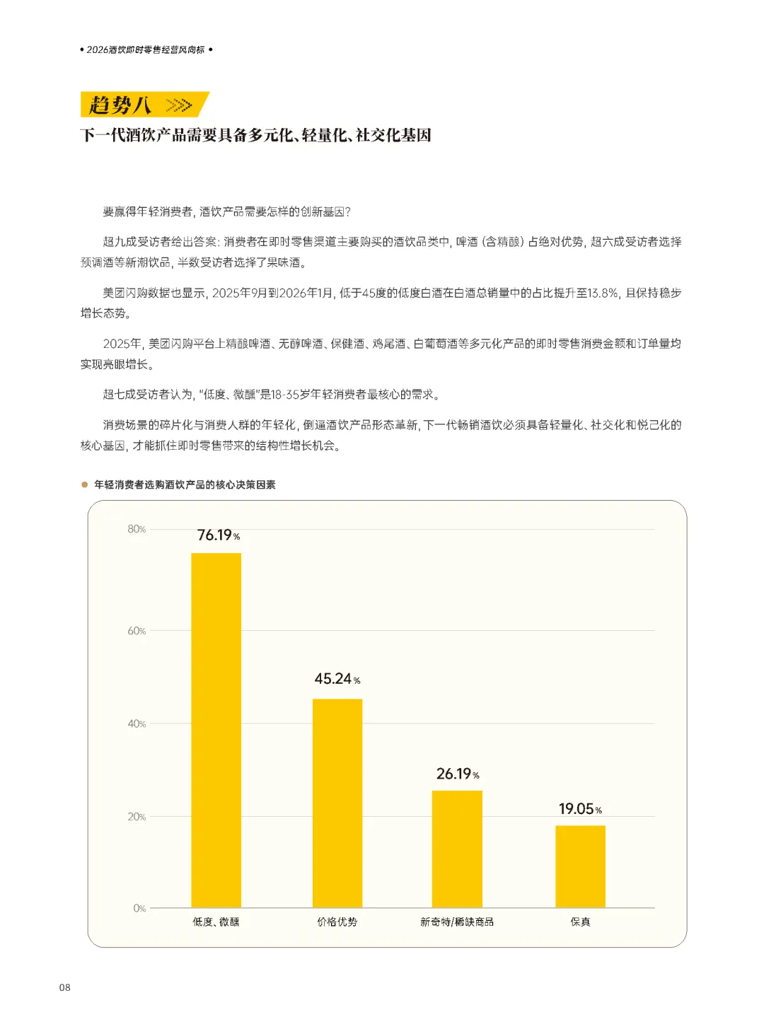 八、产品创新:多元、轻量、社交化。单一品类打天下的时代结束,下一代酒饮产品需具备多元化、轻量化、社交化基因。小瓶装、低度酒、联名款等创新形态更受青睐。
