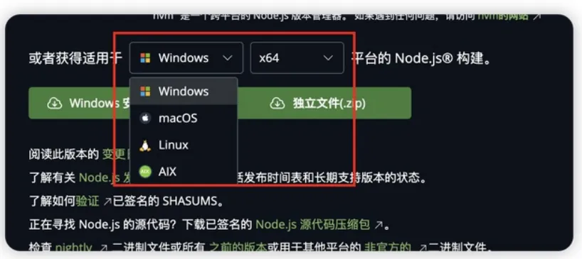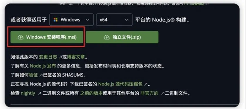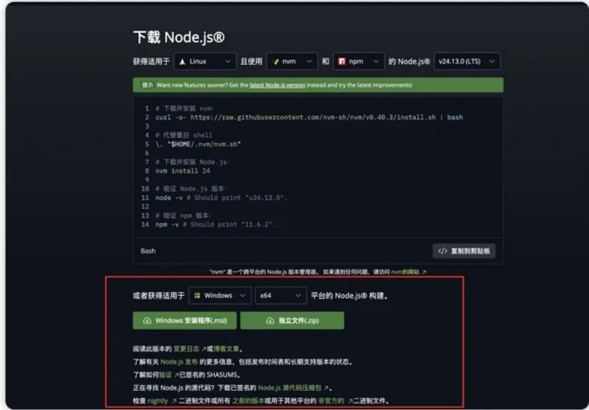 登录官网:https://nodejs.org/zh-cn/download下载 node.js,这个是使用 openclaw 的基础。如果已经安装过建议使用nvm管理多个版本,注意要安装最新版本。