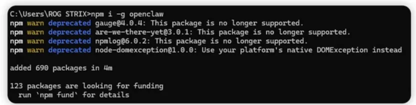 git config --global url."https://github.com/".insteadOf ssh://git@github.com/git config --global url."https://github.com/".insteadOf "git@github.com"npm cache clean --force然后再按照上面网站执行的要求来进行安装,发现就可以了。不过我不能完全保证这个可以成功,因为可能涉及到多种环境问题,但是这个已经可以把多数人无法安装的卡点解决了。就拿我现在看到官网的命令为例npm i -g openclaw你会看到一直在执行,这个时间稍微有点长,需要等待,等到看到如下结果才算完成