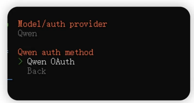 我们这次选择阿里的千问大模型,可以免费用,不过能力可能没那么好,但是简单任务还是够用了。我们先去官网注册一下账号才可以使用,访问这个地址完成注册:https://chat.qwen.ai/注册完成后并登录,然后我们回到刚才的页面,选择 qwen大模型,然后回车