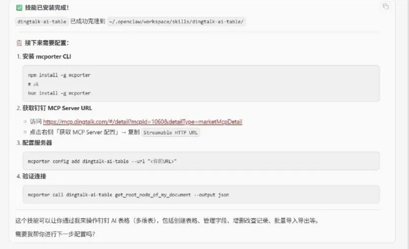 此类问题直接导致小龙虾无法关联钉钉表格,无法发起任何问数操作,是最基础也是最高频的问题,多与技能安装、MCP协议配置相关。
