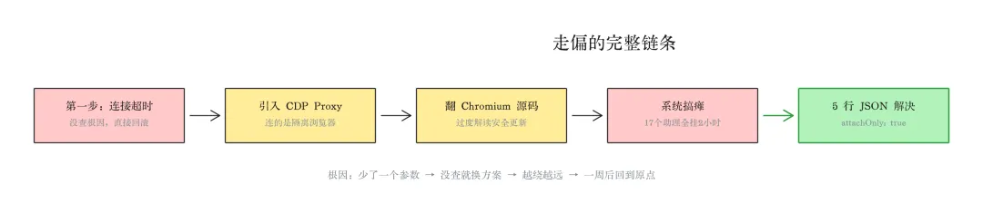 错误链条事后看很清晰:少了一个参数导致超时 → 没查根因直接切方案 → 越绕越远 → 最后被 5 行 JSON 解决。
