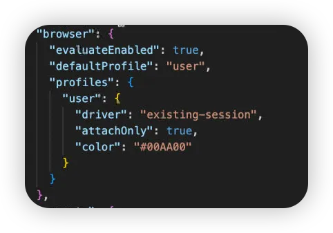 {"browser":{"defaultProfile":"user","profiles":{"user":{"driver":"existing-session","attachOnly":true}}}}改完重启 Gateway: