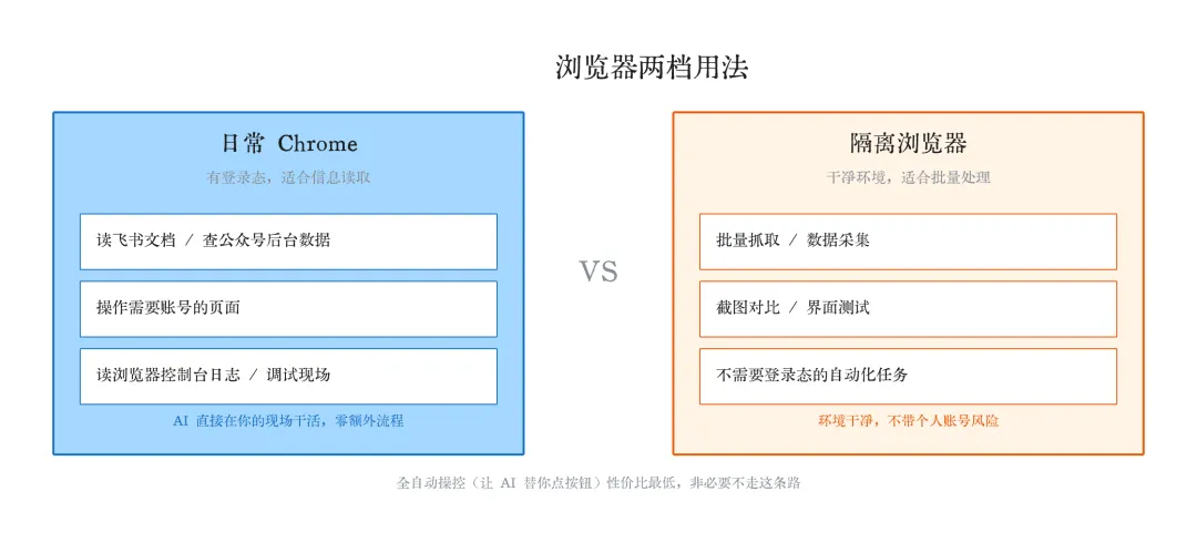 所以我现在的用法是两档:需要登录态的信息读取,用日常 Chrome;不需要登录态的批量抓取、截图对比,用隔离浏览器。前者 AI 代劳,后者干净安全。用全自动操控代替手动点击,很少走这条路。