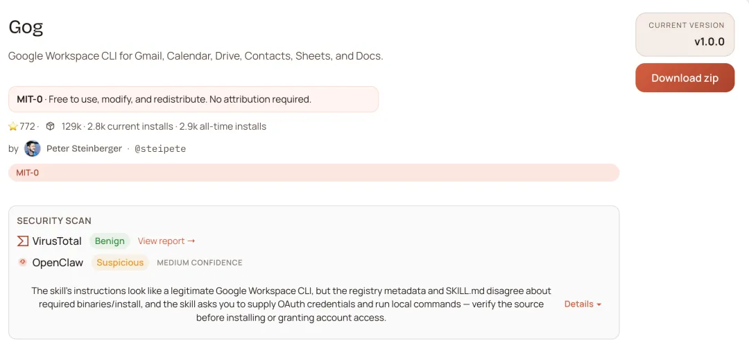 如果你也想自己试一试,可以直接去 ClawHub 上看这个 Skill 的页面:安装地址:https://clawhub.ai/steipete/gog