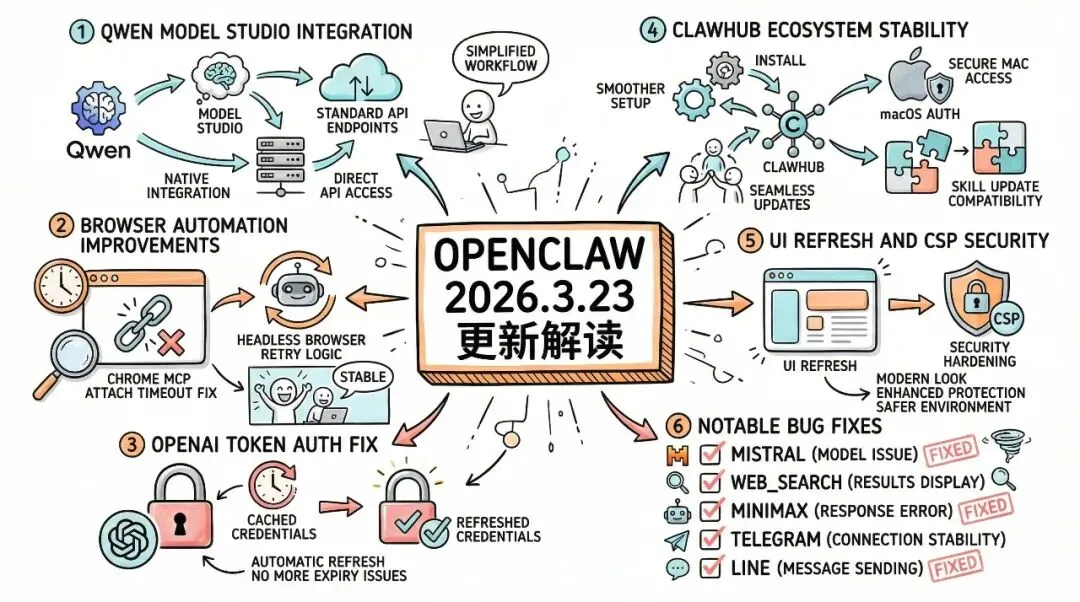 3月23日,OpenClaw 发布了 2026.3.23 版本更新。作为一款 GitHub 310k+ Star 的开源个人 AI 助手,OpenClaw 的更新节奏一直很快。这次虽然标记为"小版本",但通义千问原生接入、浏览器自动化底层优化、OpenAI Token 认证修复等多个变化,都直接解决了我日常使用中的痛点。下面逐一聊聊我关注到的重点。 |