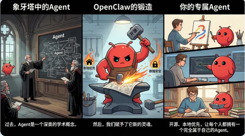OpenClaw 踩准了这个时间点。它不是发明了 Agent 的概念,学术界研究 Agent 已经很多年了。它做的事是:开源、本地优先、让每个人都能拥有一个完全属于自己的Agent。
