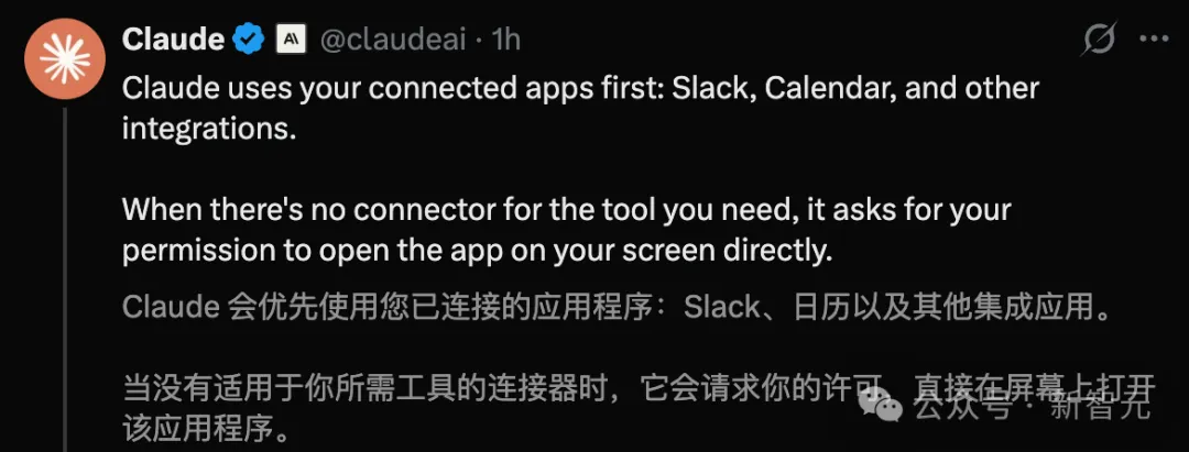 Claude操控电脑的背后逻辑,优先使用Slack、日历,以及其他已连接的集成应用。