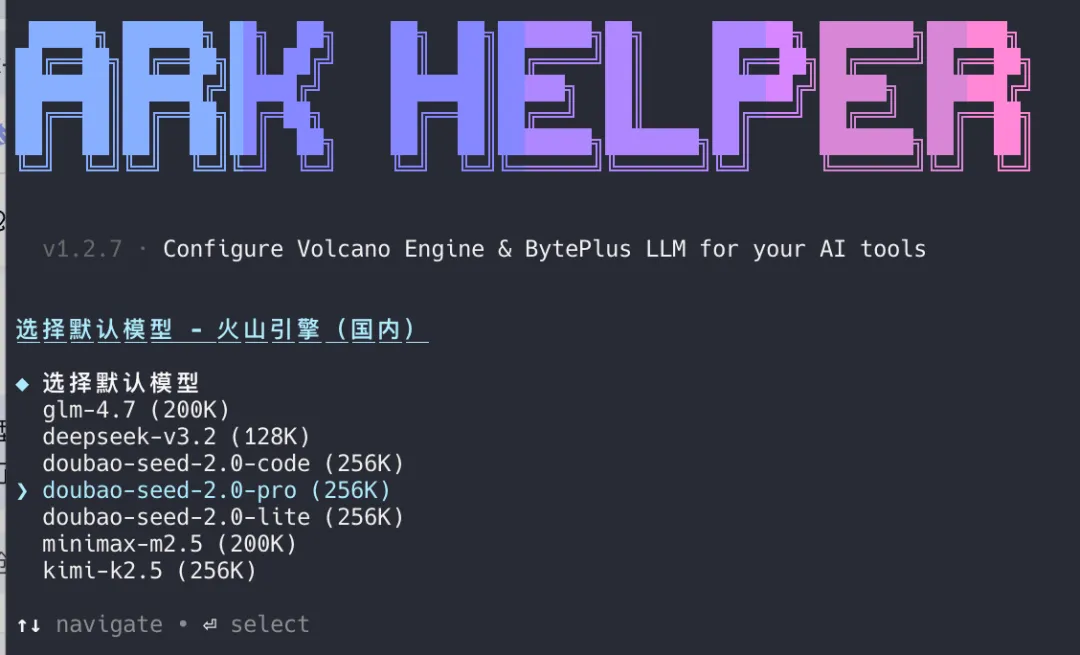 npm install -g openclaw@2026.3.13第二条命令是安装火山引擎的ark-helper,它会自动检查你的系统,帮你配置模型(这里选择哪个默认模型对🦞都没影响,OpenClaw内可以方便的进行选择)。