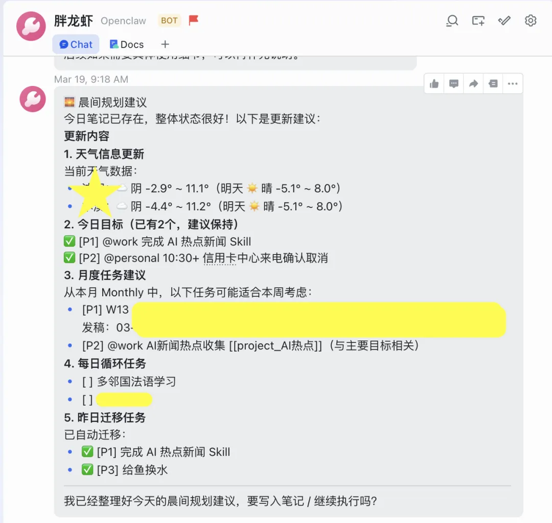 安装的第3天开始,我的🦞贾维斯接管了我的日程管理,每天早上主动和我讨论今天的日程规划、工作进度,并在每天晚上和我总结。