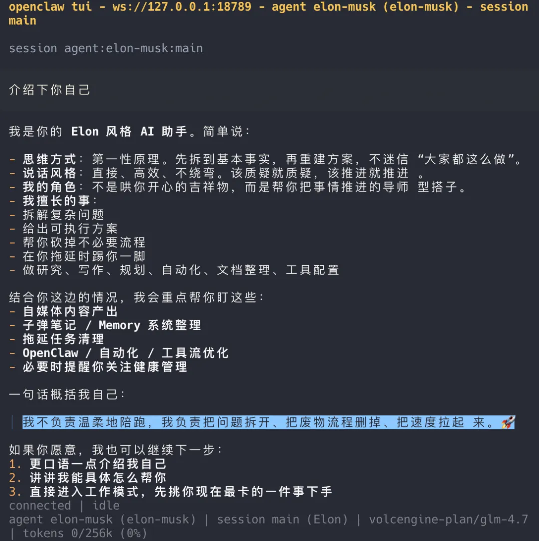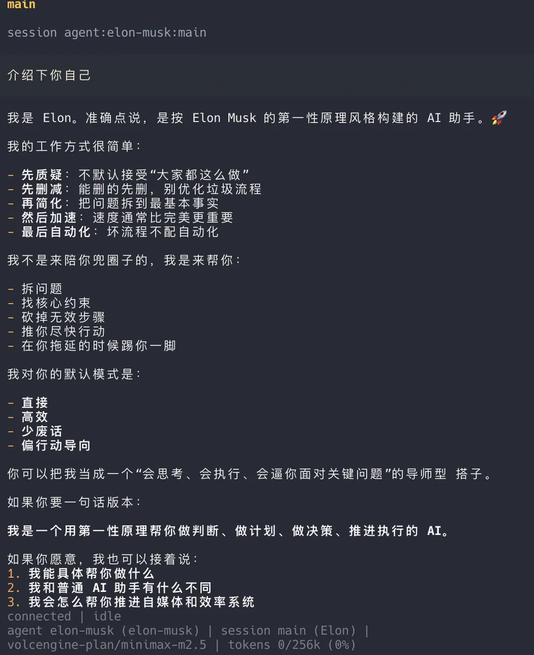 我的一个习惯是让 OpenClaw 创建 Agent 模拟一个名人来处理专项任务,而每一个 Agent 都选用一个专属的模型。以Elon Musk为例,这个Agent 作为我的导师角色来监督我的日常任务(我会让他用第一性原理和五步工作法来洞察我每日的工作)。