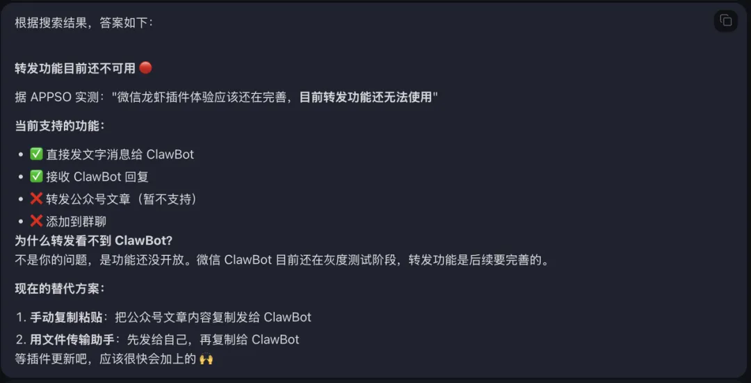 目前 OpenClaw 支持的功能有限,只能通过 ClawBot 和自己的🦞进行沟通,还没有很好的融入微信的系统,不支持转发给微信ClawBot,查找微信联系人等功能,有点鸡肋,期待后续更新吧。