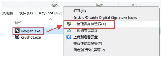 16.继续回到Crack文件夹内,选中【Keygen】程序,鼠标右键选择【以管理员身份运行。